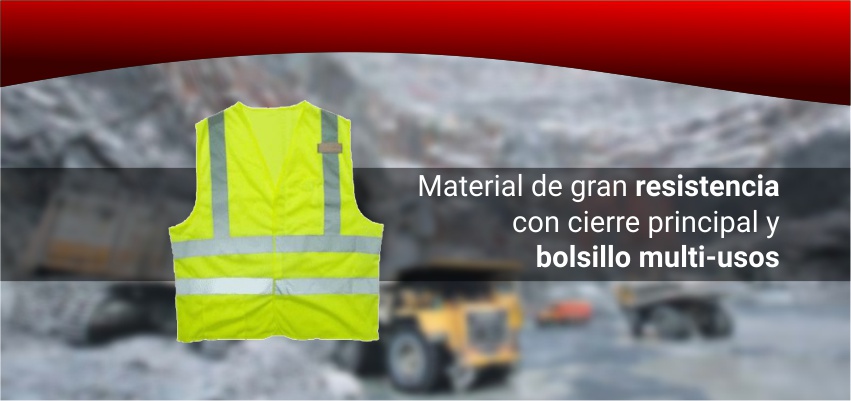 Material de gran resistencia con cierre principal, bolsillo delantero multiusos con cintas reflectivas de 2 pulgadas para uso textil 2 vesticales en el pecho y cruzadas en la espalda, compuesta de lentes retro-reflectantes de ángulo amplio (micro esferas de vidrio) con valor de reflexión de 500 lux por metro cuadrado o superior en la parte frontal y posterior.